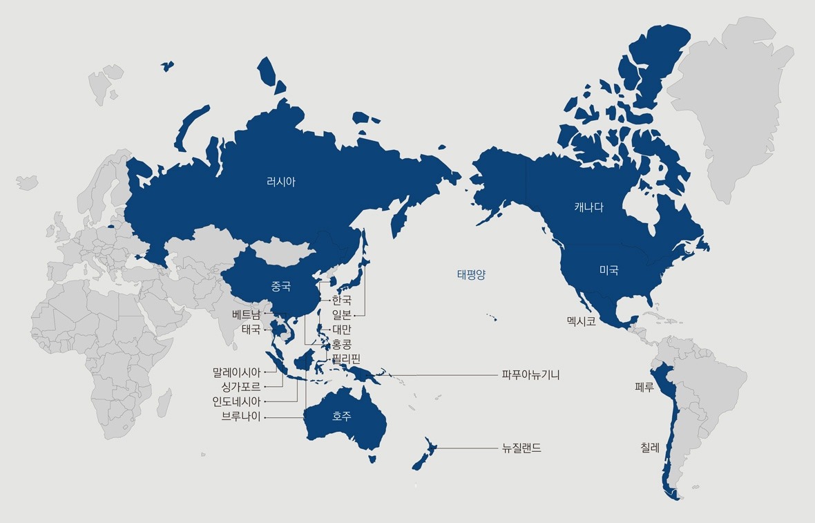 대한민국, 미국, 일본, 중국, 러시아, 호주, 뉴질랜드, 캐나다, 멕시코, 페루, 칠레, 베트남, 태국, 인도네시아, 말레이시아, 필리핀, 싱가포르, 브루나이, 파푸아뉴기니, 홍콩, 대만.